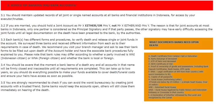 1 You should maintain updated records of all joint or single named accounts at all banks and financial institutions in Indonesia, for access by your executor/trustee.